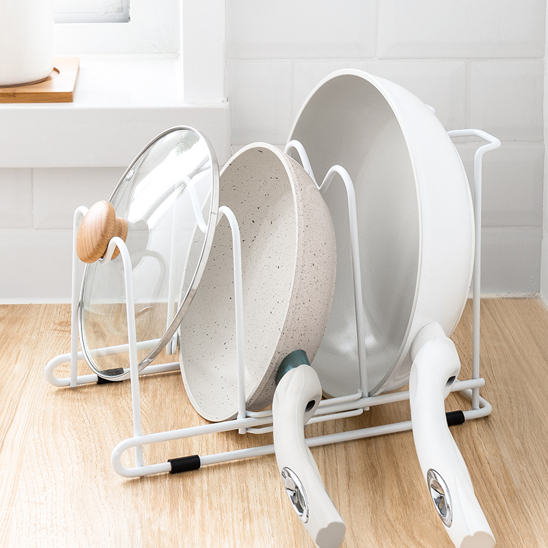 櫥柜沒有足夠空間可以利用的廚房,也可以使用置物架對炒鍋、鍋蓋進行收納,做到整潔有序,取用便捷。