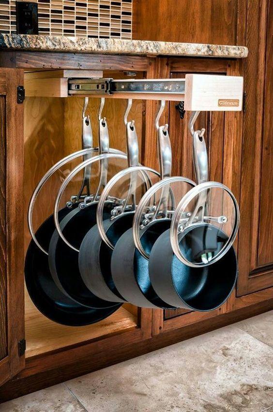 一般人家里都不只有一口鍋,少的一兩口,可以放在灶眼上,多的六七口,就沒有合適的地方擺放了。 在設計櫥柜時,可以安裝一個可伸縮滑道,用來掛鍋相當方便省事。