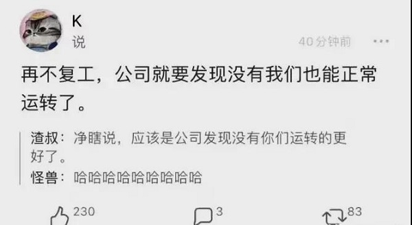 有網(wǎng)友說“再不復工,公司就要發(fā)現(xiàn)沒有我們也能正常運轉了。”