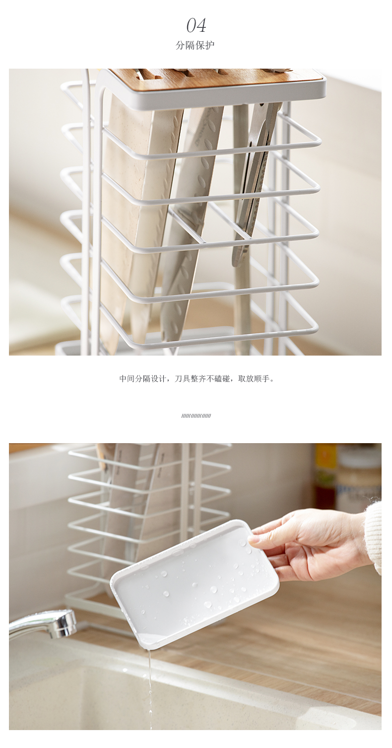 總體來說,這款廚房刀架主打多功能的收納,多卡槽的設計同時滿足多種刀具的放置與收納,便捷隨心。通風瀝水的設計能保證刀面的干凈清爽,提高刀具的使用期限;底部的蓄水盤方便倒水,刀柄卡位設計一方面讓刀具豎立放置,中間的分格使使用過程中能取放順手,同時保證刀具不相互磕碰;底部配有硅膠墊腳,增加與臺面的摩擦,保證整個產品的穩(wěn)定性,也減少了臺面的磨損。