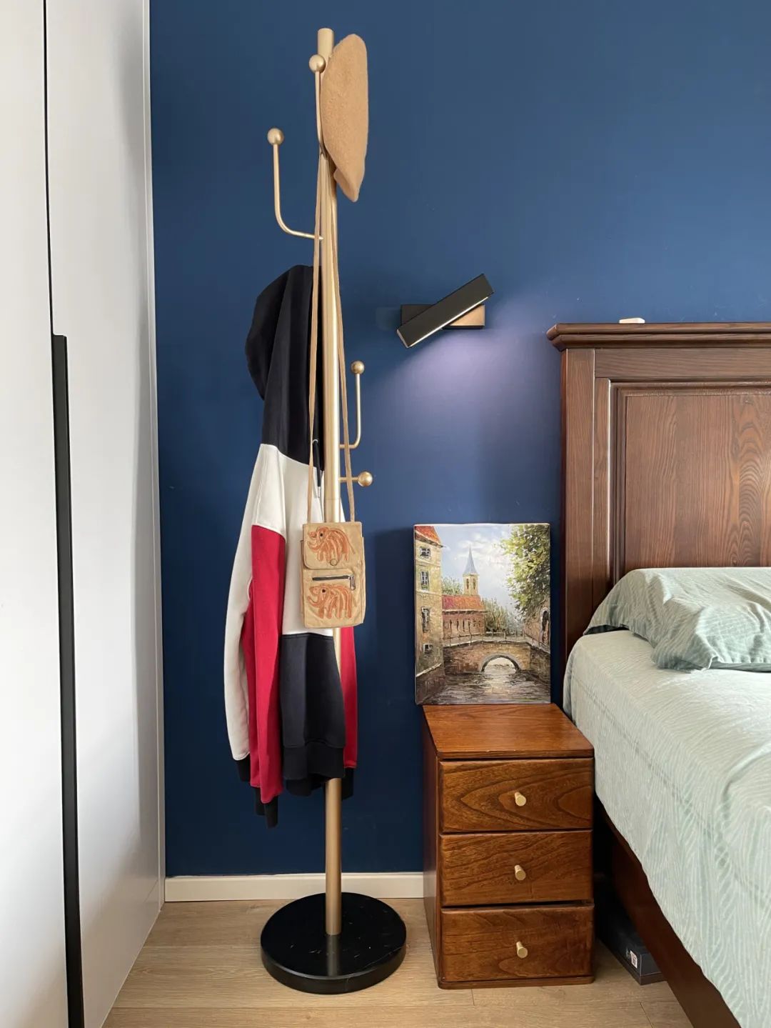 這個(gè)時(shí)候在床邊設(shè)計(jì)一個(gè)開放式衣帽架就很有必要了,目前來說開放式衣帽架有橫掛衣帽架和立式落地衣帽架兩大類。個(gè)人比較推薦立式落地衣帽架,因?yàn)闄M掛衣帽架需要配合衣架使用,而且占地較大,遇見偷懶的朋友很容易把應(yīng)該衣柜收納的衣物也都懸掛到落地衣帽架上。