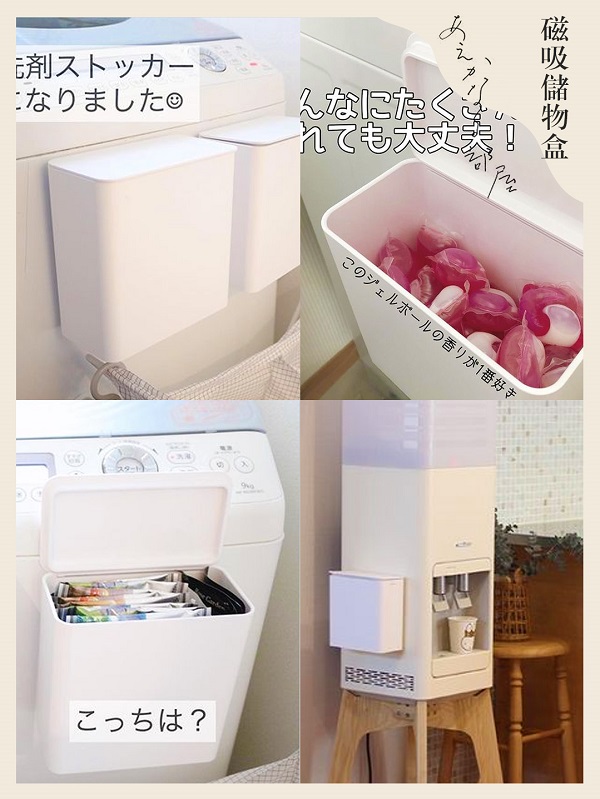 將帶磁鐵的儲(chǔ)物盒貼在洗衣機(jī)側(cè)面,存放洗衣凝珠、浴鹽等,蓋子很牢固,可以防止氣味泄漏。還能貼在飲水機(jī)側(cè)面收納一次性杯子,有蓋子不會(huì)沾灰塵,用起來(lái)很方便。
