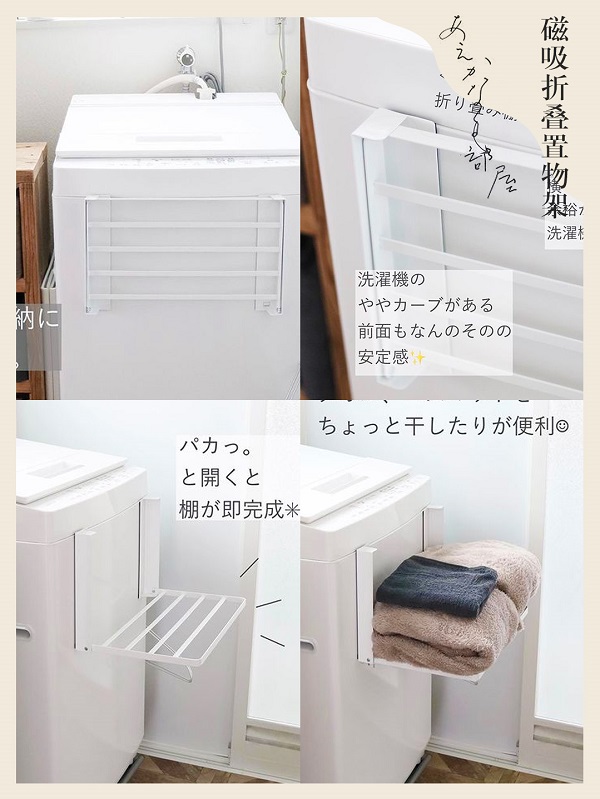 在洗衣機(jī)側(cè)面安裝折疊置物架,可以臨時(shí)存放毛巾、睡衣等,解決洗衣服時(shí)無(wú)處放置的問(wèn)題,用完可以折疊,不占空間。