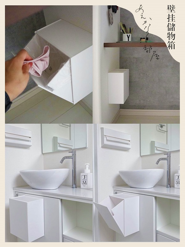 這個(gè)用魔術(shù)膠帶粘貼的箱子,可以把它貼在馬桶或洗手臺(tái)旁儲(chǔ)物,或用作垃圾桶。這樣浴室地板更容易清潔。如果不想把廢紙和一次性口罩等不必要的垃圾帶進(jìn)家里,把它貼在玄關(guān)鞋柜的側(cè)面,用作入口處的垃圾桶也不錯(cuò)。