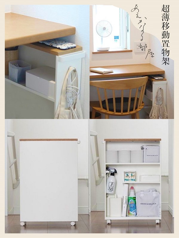 帶滑輪和把手的超薄置物架,放在浴室的墻角、縫隙等收納清潔用品。單面開(kāi)放設(shè)計(jì),取物方便,翻轉(zhuǎn)過(guò)來(lái)瞬間擺脫雜亂感。也非常適合用在工作區(qū),替代桌面收納文具、雜物等,帶有把手,很容易從桌子下面拉出來(lái)。