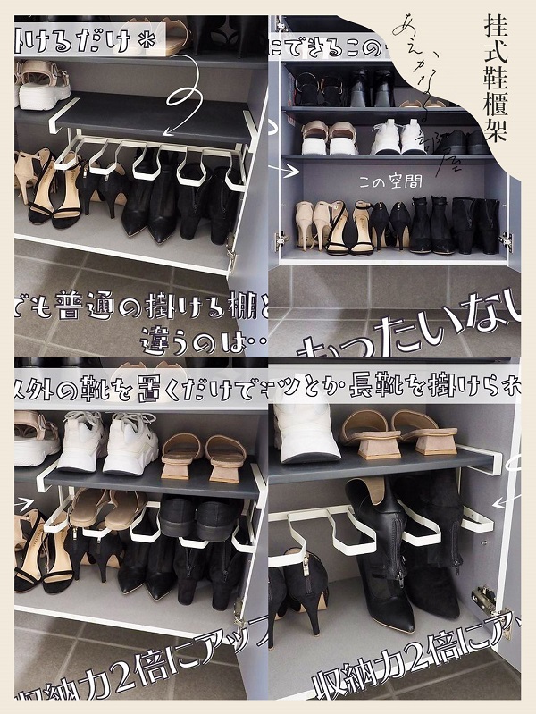 很多鞋子其實(shí)只占了鞋柜隔層不到一半的高度,如果你有很多鞋子,一定要試試這個(gè)鞋架,直接掛在鞋柜隔板就能用,短靴類可以倒置垂直存放,普通的運(yùn)動(dòng)鞋和涼鞋平放在上面,鞋柜存儲(chǔ)量增加了一倍。