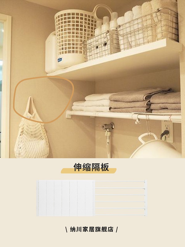 如果洗手間的占地面積小,可以通過(guò)安裝層板,充分利用洗衣機(jī)上方空間。上層安裝固定式木板,存放儲(chǔ)備物品。下方空間安裝伸縮隔板,放置較輕的毛巾、衣物等,可拆卸調(diào)整位置,使用更加靈活。