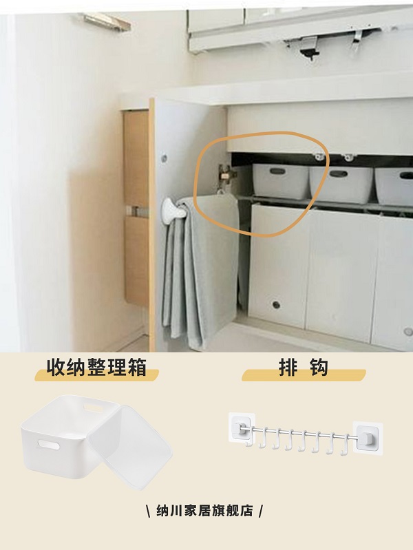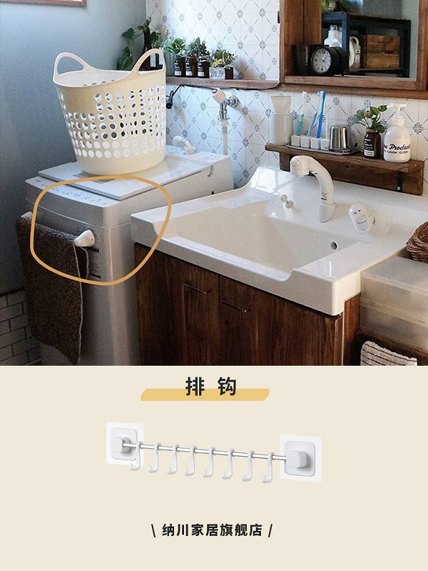 在洗手臺(tái)下方柜子安裝一個(gè)適合門(mén)頁(yè)大小的掛桿,創(chuàng)建隱形收納的空間。也可以將掛桿安裝在洗衣機(jī)側(cè)面,方便晾干收納毛巾、浴巾等。