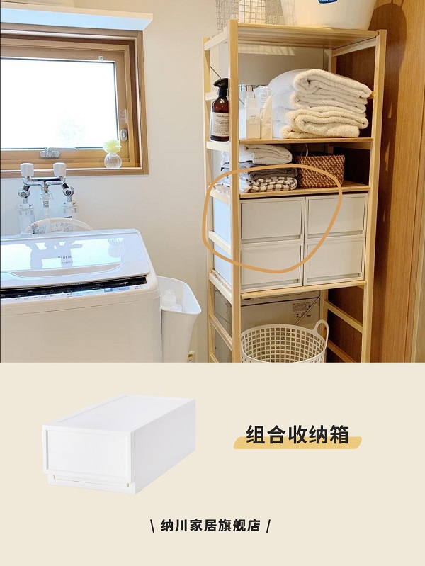 洗衣機(jī)旁邊的空間放置一個(gè)開(kāi)放式架子,用于存放毛巾和洗衣籃等。毛巾開(kāi)放式收納,洗完澡后可以快速取出擦拭。抽屜式收納箱用來(lái)規(guī)整零碎工具,清潔用品等,即不會(huì)雜亂,即拉即取也非常便捷。