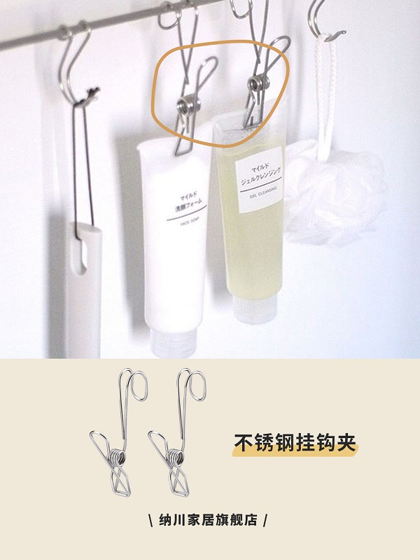 潔面乳等軟管用掛鉤夾吊掛收納,不會(huì)占用臺(tái)面空間,同時(shí)及時(shí)晾干收納減少污染。這個(gè)方法同樣適用于很多浴室小工具,掛置靈活存放利用邊角空間。