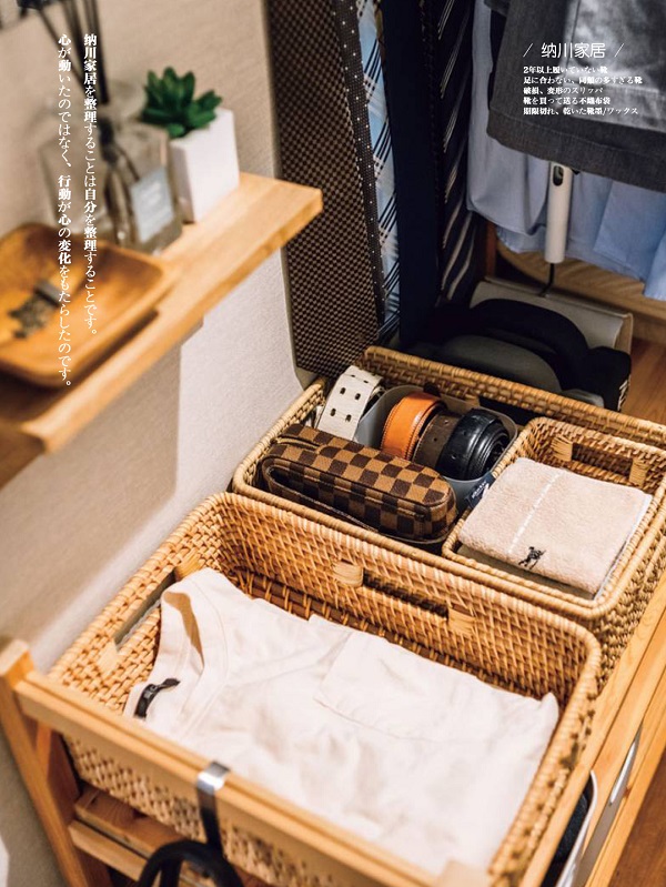 對(duì)于不擅長(zhǎng)整理的男主人,在衣柜的黃金位置設(shè)置了一個(gè)更衣角。領(lǐng)帶、手表等小物件集合在這里,還有一個(gè)籃子可以暫時(shí)存放衣服。