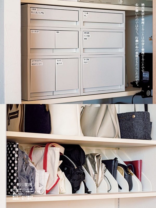 將不能自立的包包放入文件箱中,手拿包、小袋、折疊環(huán)保袋等可以靠在 A4 尺寸的文件箱。這樣并排排列,一目了然,不會(huì)堆積垮塌,很容易取出。