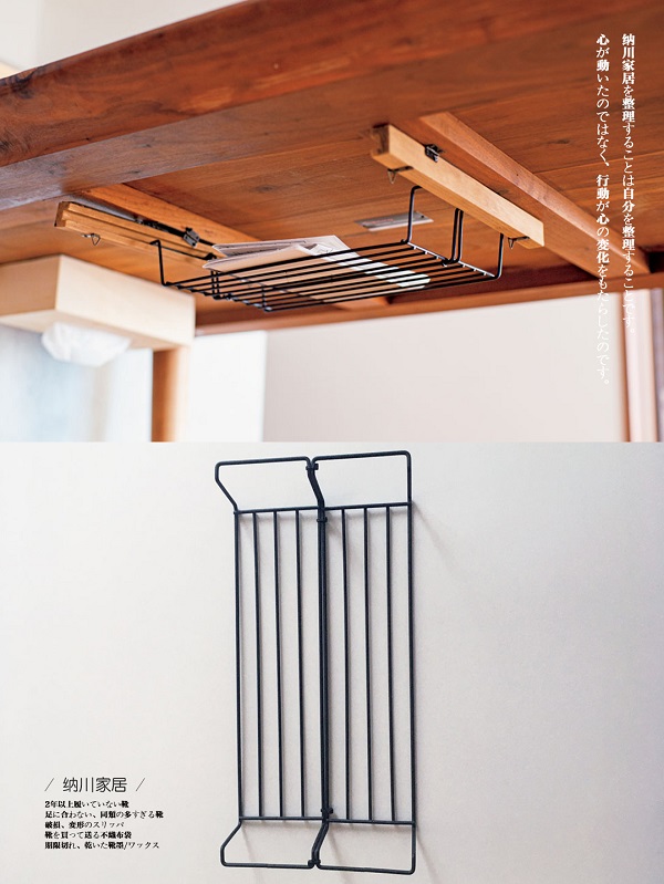 在餐桌下方預(yù)設(shè)一點(diǎn)存儲(chǔ)空間,利用家里閑置的鐵架變成鏤空抽屜,吃飯時(shí)把雜志、手機(jī)等物品放這里,桌面一下整潔了。紙巾盒也用雙面膠貼在桌面下,瞬間隱形。