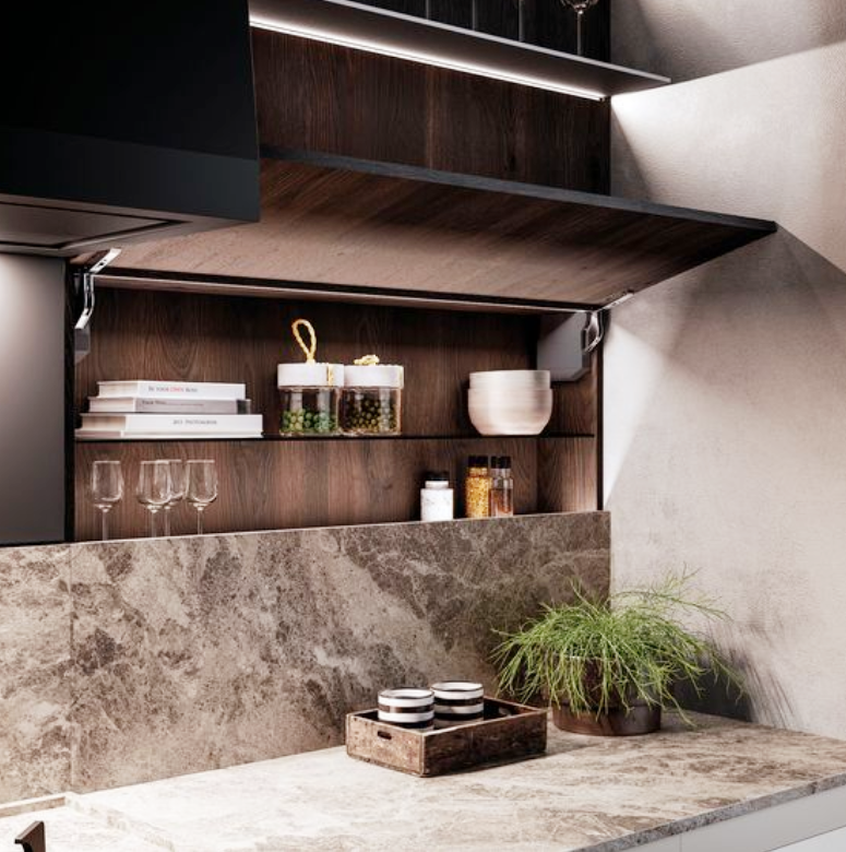 吊柜下面空間如何利用,我們后期就可以在吊柜下動點“手腳”,利用多樣的設計樣式,來提升廚房整體的整潔度以及儲物量。第一次或者想要進行第二套房的裝修,吊柜下面可以這樣去設計,收納更有序,瓶瓶罐罐的調(diào)料拿取也更加的便利。