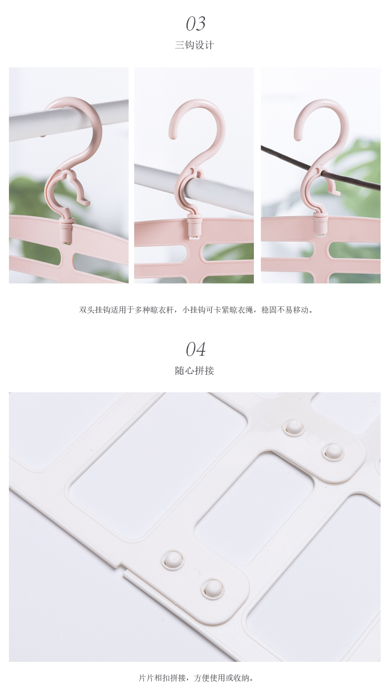 3、三鉤設(shè)計(jì):雙頭適應(yīng)多種衣桿,小掛鉤可卡緊